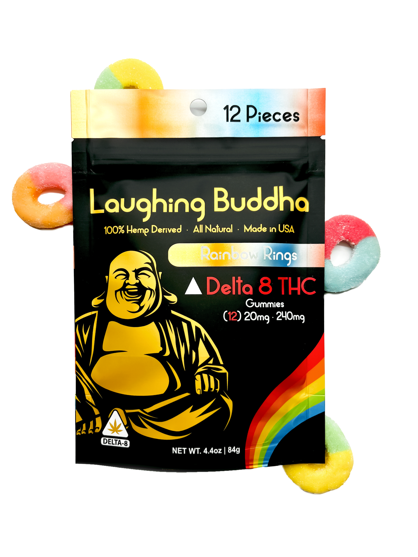 We offer delicious fruit-flavored Laughing Buddha edibles. Purchase a pack of 12 Delta 8 edible rainbow rings ready for you to enjoy. Click here to get yours.